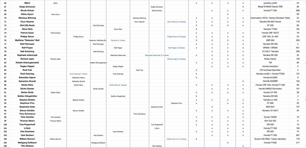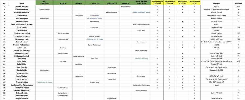 Below you will find the current registration status for the GERMAN FLATTRACK CUP 2026. Riders are listed alphabetically in their respective classes (green) and for their respective races (yellow). If any information is incorrect, please send a brief email to jf@german-flattrack.de. Since there have already been several changes, additions, cancellations, and registrations, we cannot rule out transmission errors.