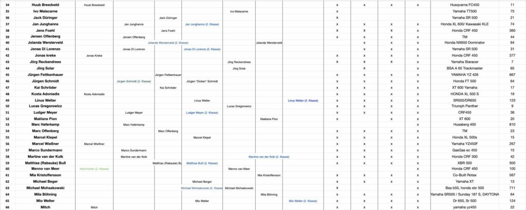 Fahrer in alphabetischer Reihenfolge in den jeweiligen Klassen (grün) und bei den jeweiligen Rennen (gelb).